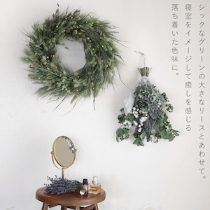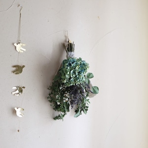 北海道産あじさいのブルーグリーンに、富良野産ラベンダー4号おかむらさきをユーカリとあせびのグリーンでまとめた爽やかでシンプルな印象のドライフラワースワッグです。