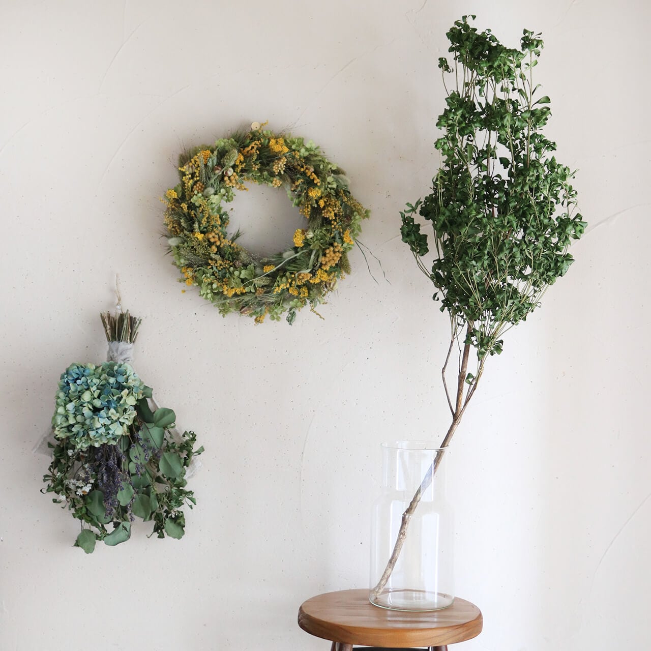 あじさいグリーンアナベルのようなグリーン系のドライフラワーや観葉植物、アンティーク雑貨とディスプレイするとボタニカルなインテリアに。