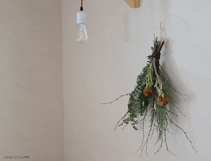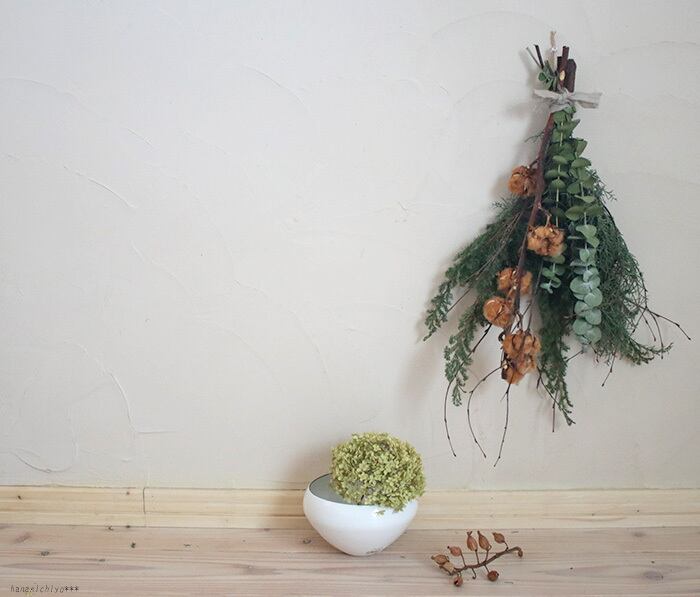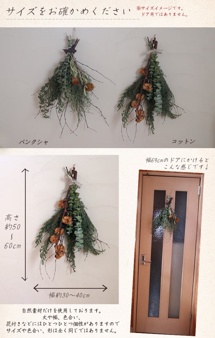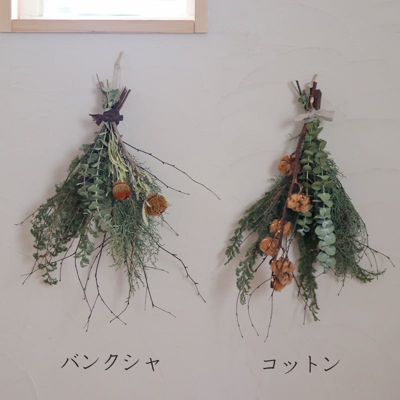 ◆バンクシャや綿の実は1つずつ枝ぶりや色、形、大きさが異なるのでそれに合わせて花材の配置や雰囲気が多少異なります。