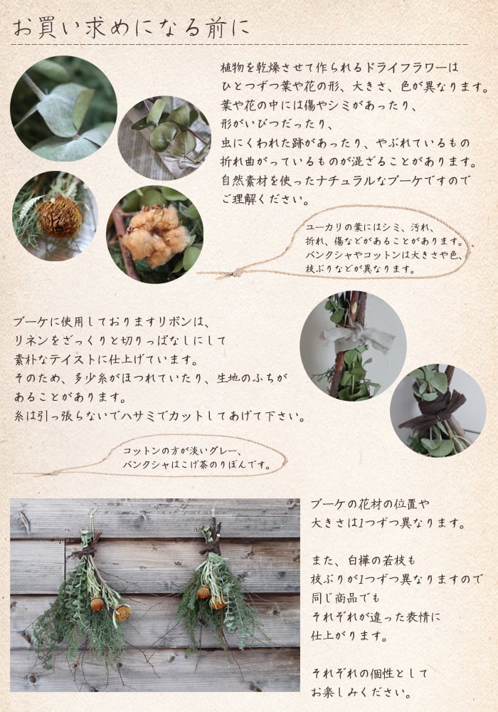 ◆ドライフラワーは自然の植物ですので、それぞれに形や大きさ、色、枝ぶり、花の開き具合に個性があります。