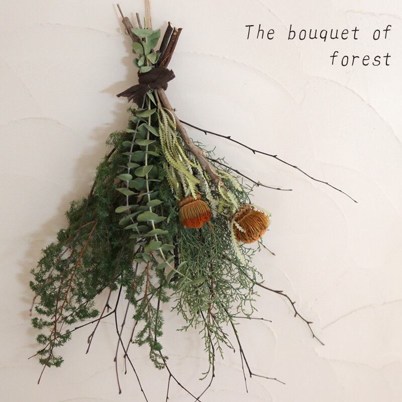 森のブーケ * 富良野の森をイメージして * 白樺の若枝と杉やブルーアイスのシックなグリーンのドライフラワーブーケ